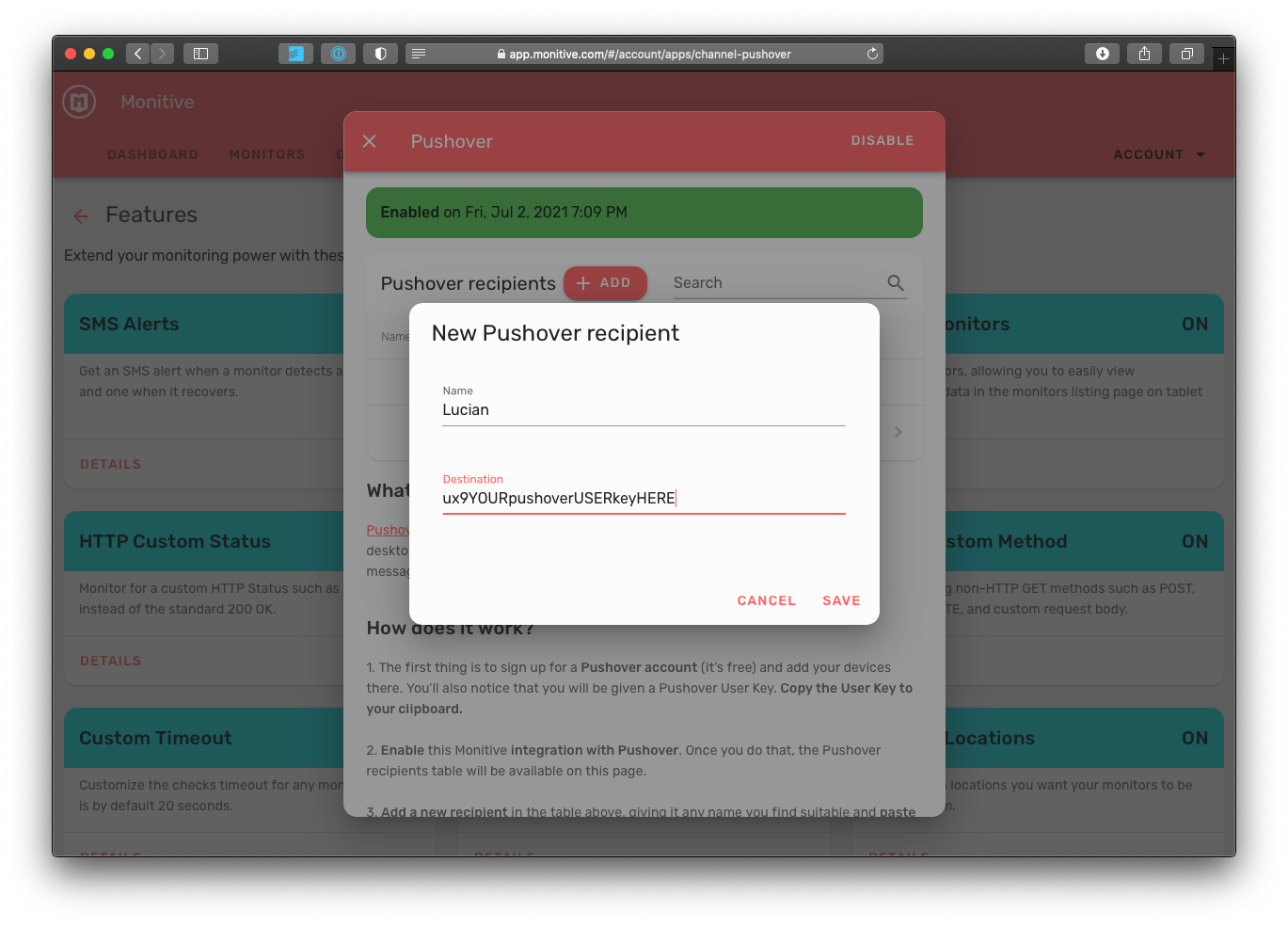Now add your first Pushover recipient:
